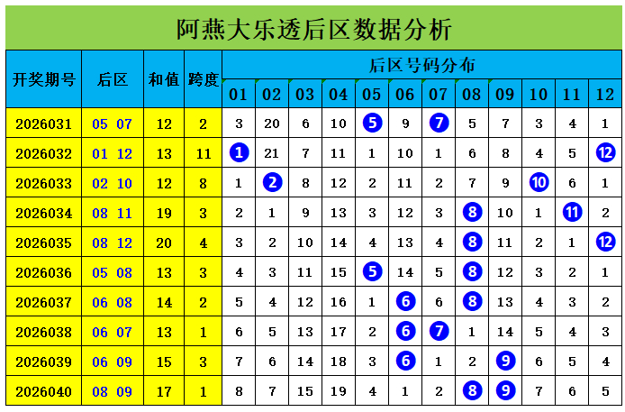 上期回顾:大乐透第2026040期奖号为:前区06、12、13、21、34,后区08、09,前区奖号三区比为2:2:1,奇偶比为2:3,大小比为2:3,后区开出大大组合08、09